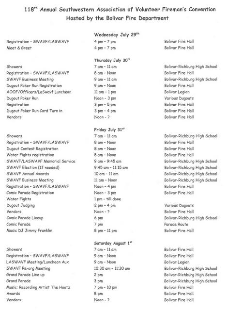 118th Annual Conventionof the Southwestern Association of Volunteer FiremenHosted byBolivar Fire DepartmentJuly 29 to August 1, 2026